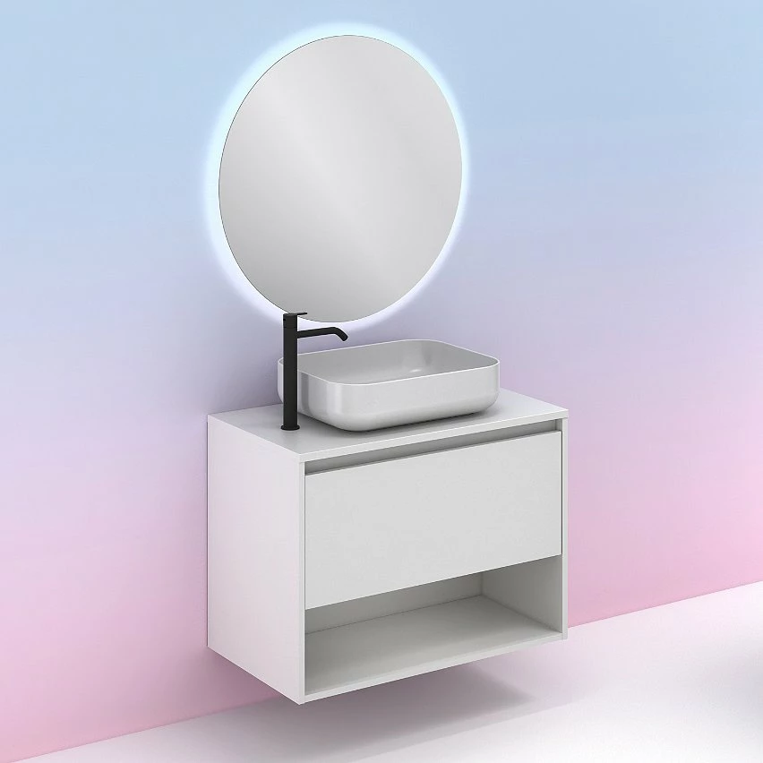 Nouveau ❤️ Amizuva Ensemble de meuble, vasque et miroir NIWA TOP avec un tiroir et un niche H.56,5 x L.80 x P.46 , effet blanc brillant 👏