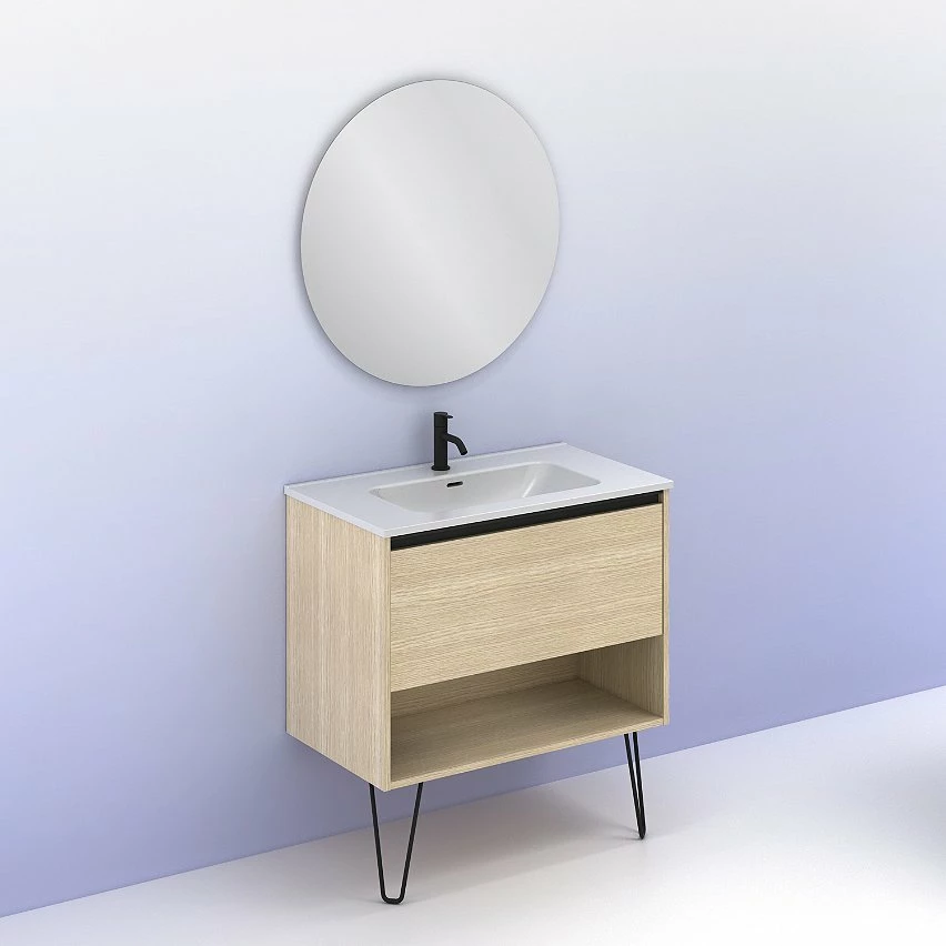 Meilleur prix đ Amizuva Ensemble de meuble, vasque et miroir YOKO avec un tiroir et un niche H.56,5 x L.80 x P.46 , effet ChĂȘne sablĂ© đ„°
