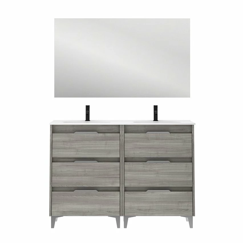 Remise ✨ Amizuva Meuble double vasque SUKI avec six tiroirs H.74 x L.120 x P.46 , effet Gris sablé | Il comprend la vasque en céramique ✨