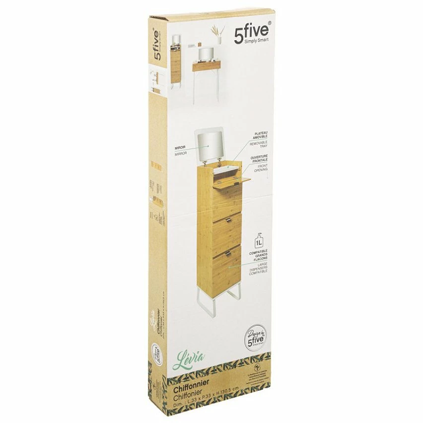 Craquez pour le style de ce chiffonnier avec miroir Levia en bambou en coloris naturel et blanc. Idéal dans une chambre ou une salle de bain, le chiffonnier Levia dispose de 3 tiroirs et un abattant. Le + du produit : le plateau supérieur se lève pour accéder à un compartiment range poche avec plateau blanc amovible et un miroir intégré. A monter soi même. Dimensions : L. 33 x l. 33 x H. 130 cm. Poids : 19.8 kg. Matière : Bambou, fibres de bois MDF et métal. Marque : 5Five.