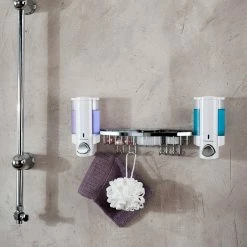 Idéale dans la cabine de douche ou près de la baignoire, cette étagère équipée de 2 distributeurs de savon se fixe facilement au mur. Pas besoin de perceuse, elle est livrée avec un tube de colle silicone et de l’adhésif double-face qui assurent une fixation murale simple et efficace sur le carrelage, le verre, le miroir ou le métal. L’étagère en acier inoxydable est équipée de crochets pour suspendre éponge, fleur de douche ou gant de toilette. Les réservoirs translucides, contenance 325 ml chacun, permettent de surveiller le niveau et de les recharger au bon moment avec savon, gel douche, shampooing ou après-shampooing. Le mécanisme des pompes est garanti à vie.