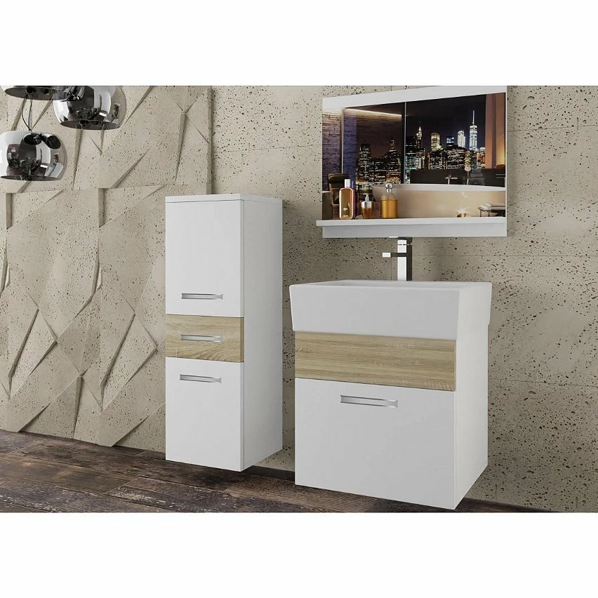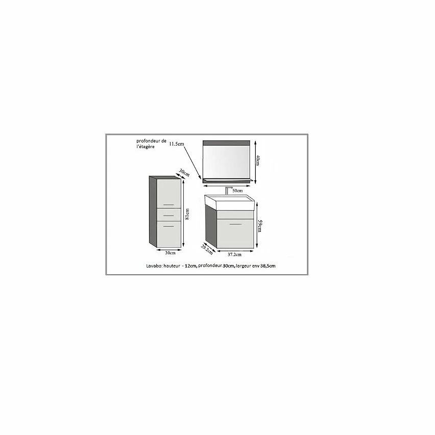 Élégant et fonctionnel cet ensemble de meubles de salle de bain suspendu vous permettra de mieux organiser votre salle de bain grâce à ses nombreux rangements. Il est composé d’une vasque, un meuble sous vasque, une armoire colonne ainsi qu’un grand miroir avec une étagère pratique. De plus, sa finition très tendance ajoutera de l’élégance à votre salle de bains., POINTS FORTS: Ensemble de 4 éléments: miroir avec étagère, lavabo, meuble sous-vasque à suspendre, armoire colonne à suspendre, Le sens d’ouverture de la porte peut être fixé à droite ou à gauche, Finition: corps en blanc mat, faces en blanc mat et aspect bois, Vasque en porcelaine blanche, Meubles fabriqués en Europe, CARACTÉRISTIQUES TECHNIQUES: Dimensions – Meuble sous-vasque: largeur: 37.2 cm, profondeur: 29.2 cm, hauteur: 59 cm (avec vasque), Miroir: largeur: 50 cm, hauteur: 40 cm, Armoire: largeur: 30 cm, profondeur: 30 cm, hauteur: 81 cm, Dimensions de la vasque: hauteur: 12 cm, profondeur: 30 cm, largeur: 38.5 cm (dans la partie la plus large), Meubles en en panneaux de particules Decor Econatura, Robinetterie non incluse, Siphon non inclus, Photos des articles les plus fidèles possible, mais restant non contractuelles, les nuances de couleur et le rendu des matières présentés à l’écran pouvant être différents de la réalité