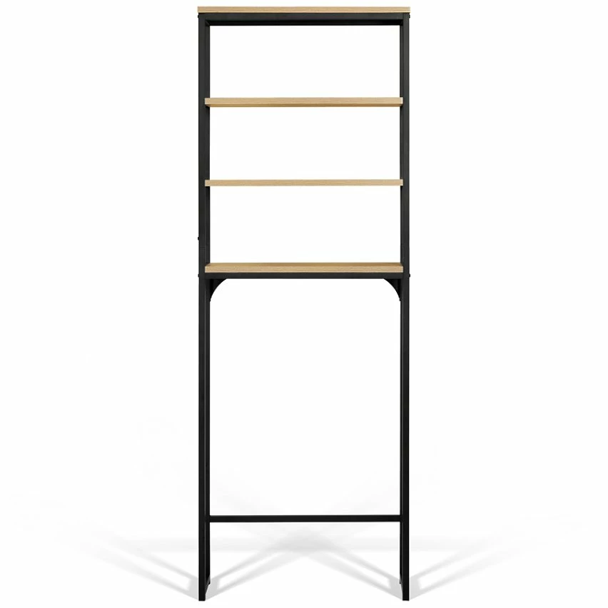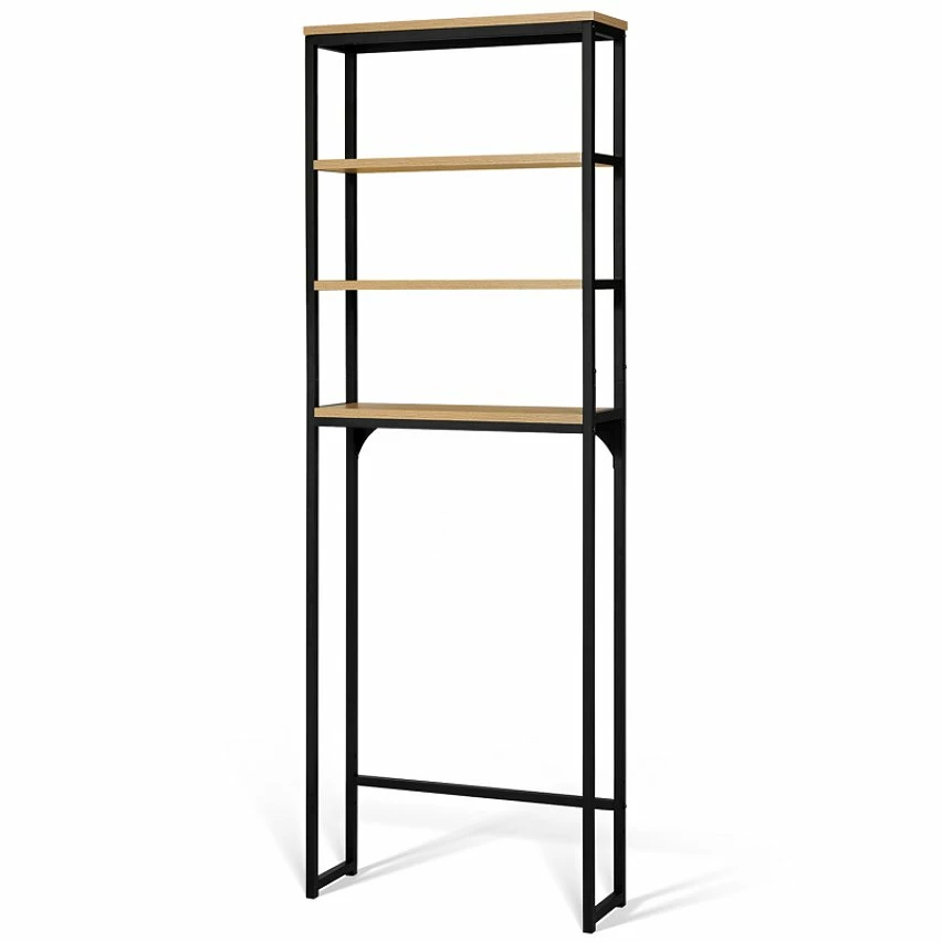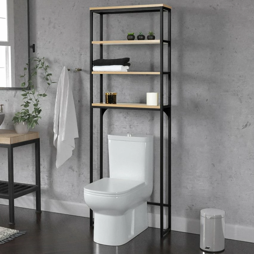 Description du meuble dessus WC DETROIT 4 étagèresDonnez une touche industrielle et optimisez le rangement de votre pièce d’eau avec notre meuble étagère dessus WC 4 niveaux design industriel DETROIT bois et métal noir. Son style moderne, contemporain et ses lignes sobres créeront une ambiance chaleureuse et un esprit « factory » très tendance !Spécial petits espaces, adapté aux sanitaires, il est idéal pour aménager aussi bien votre buanderie que vos toilettes ou votre salle de bain.La matière et la couleur des étagères en particules de bois (PB épaisseur 1,5 cm) lui confèrent une véritable authenticité. La structure du meuble, en métal noir (épaisseur des tubes 2 cm x 2 cm), lui apporte stabilité et solidité.Ce meuble de rangement compact et fonctionnel vous permettra de tout ranger à portée de main sur 4 tablettes placées à hauteur d’homme, pour ne plus rien laisser traîner au sol, et ne pas avoir à vous baisser.Cette étagère au design urbain offre de nombreuses possibilités de rangement tout en restant peu encombrante dans votre pièce. Conçue tout en hauteur, gagnez en surface au sol et placez-la au-dessus de vos toilettes ou de votre machine à laver !Elégante, cette étagère de rangement au design sobre et épuré apporte une vraie touche déco à votre intérieur.Posez dès à présent petites serviettes invités, rouleaux de papier toilette, produits d’hygiène, nettoyants et objets déco dessus !Dimensions du meuble dessus WCDimensions globales : Longueur 64 cm x largeur 19 cm x Hauteur 178 cmHauteur entre le sol et la 1ère étagère : 96,5 cmLargeur entre les 2 pieds : 60 cmHauteur entre l’étagère du haut et la 3ème étagère : 28 cmHauteur entre la 3ème étagère et le 2ème étagère : 21 cmHauteur entre le 2ème étagère et l’étagère du bas : 23 cmBarre de renfort ajustable à l’arrière du meuble.A fixer au mur pour éviter tout risque de basculement.Retrouver nos autres meubles WC ainsi que l’ensemble de la collection DETROIT sur notre boutique en ligne.