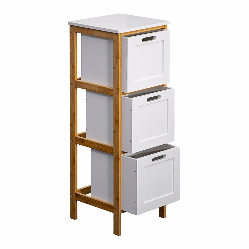 – SPÉCIFICATIONS : Dimensions : H 86 x L 32 x P 30 cm – Dimensions des tiroirs : H 21,5 x L 27 x P 26 cm – Couleur : Blanc, Marron – A assembler. Kit de montage et instructions inclus – Matériau : MDF e1, Bambou – Code RE6713