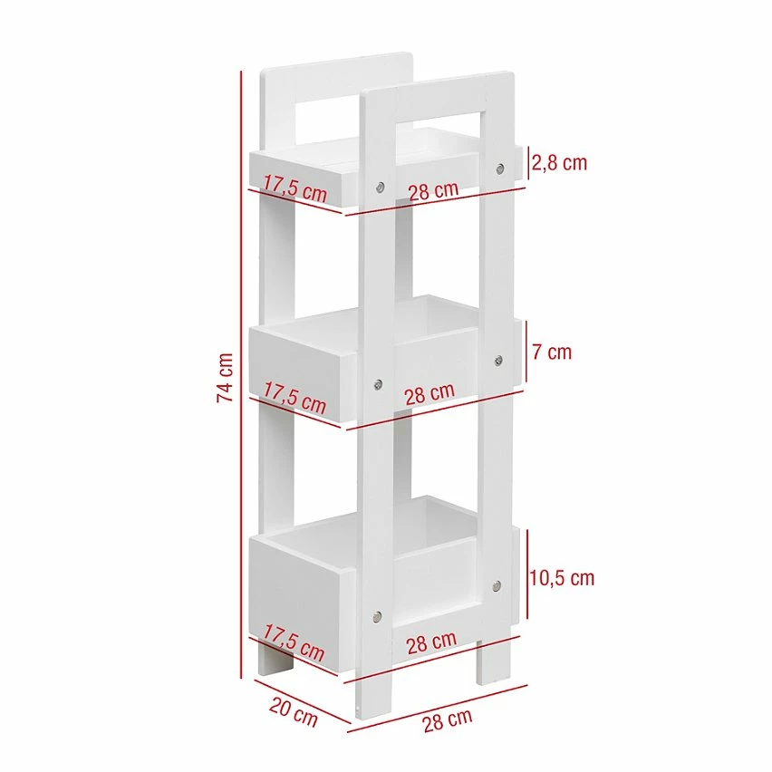 – SPÉCIFICATIONS : Dimensions : H 74 x L 28 x P 20 cm – Dimensions étagère supérieure : H 2,8 x L 28 x P 17,5 cm – Étagère centrale : H 7 x L 28 x P 17,5 cm – Étagère inférieure : H 10,5 x L 28 x P 17,5 cm – Distance entre les étagères : H 17,5 cm – Couleur : Blanc – À monter. Instructions incluses – Matériau : MDF – Code RE6737