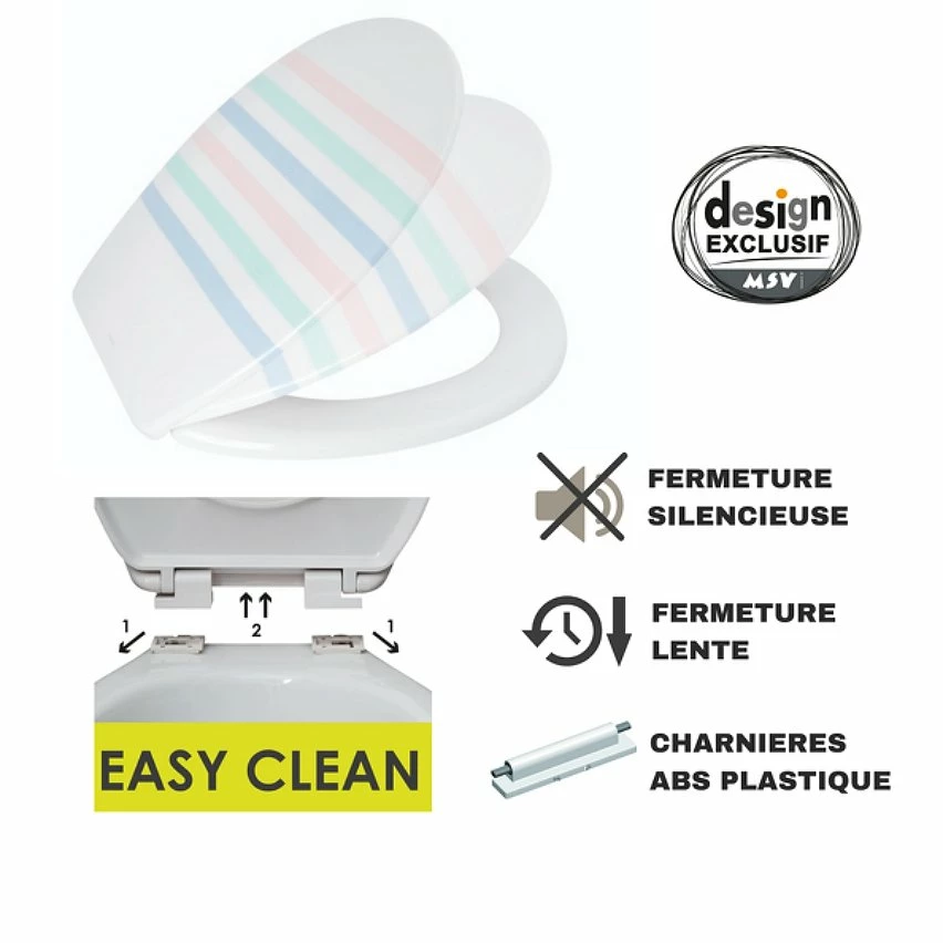 Abattant Wc de la marque MSV. HAUTE QUALITÉ: En matière Thermo-Dur avec charnières en plastique. La finition de haute qualité du siège Wc garantit une grande stabilité et une longue durée de vie. SYSTÈME EASY CLEAN: Son systeme Easy clip facilite considérablement le nettoyage du siège, il suffit de clipser pour le fixer, déclipser pour nettoyer et le tour et joué ! MÉCANISME FERMETURE LENTE: Avec cet abattant, finit les bruits dérangeants et les claquements. L’abattant Wc est doté d’un mécanisme de frein de chute en douceur intégré pour une fermeture silencieuse du couvercle. Le dessous est muni de crampons pour éviter les glissades ou les bruits forts. TENDANCE: Donnez à votre salle de bain non seulement un confort parfait, mais aussi une ambiance tendance. INFORMATION PRODUIT: Dimensions: 45,5x37x5cm Couleur: Multicolor Matière: Thermo Dur