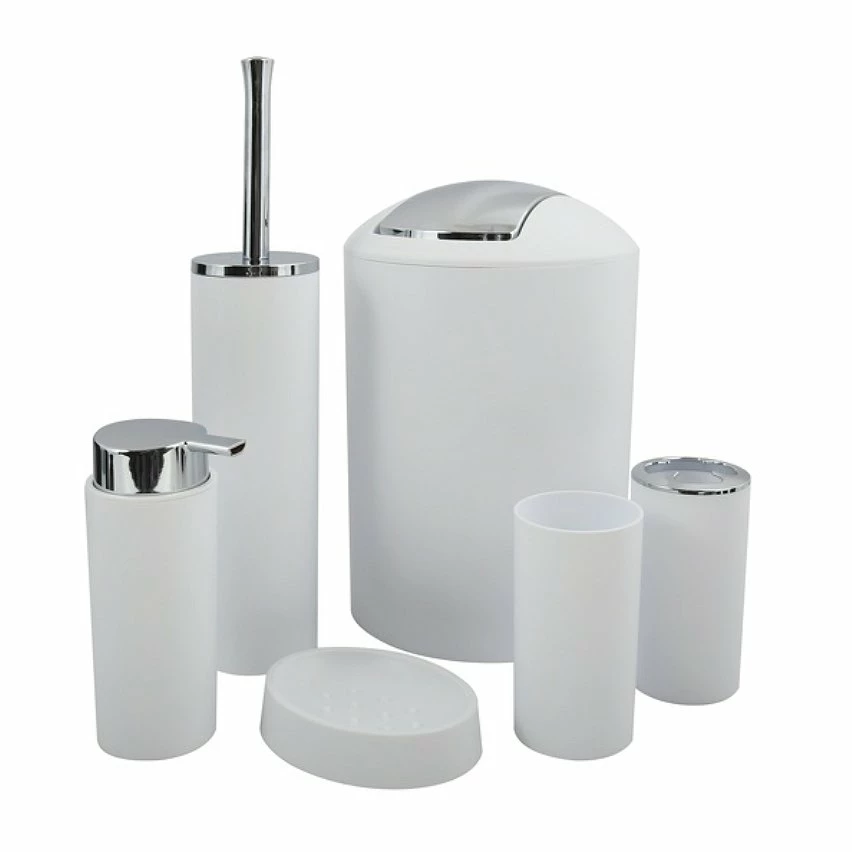 Set de salle de bain de la marque MSV. Idéal pour aménager la salle de bain de manière chic et élégante. Un lot d’accessoires qui comporte tous les indispensables d’une salle de bain : gobelet, distributeur de savon,porte savon. Un design à la fois pratique et accroche regard. Dimensions: (distributeur de savon: 6,4×8,7×17,5cm/350ml), (Gobelet: 6,4x13cm), (Porte brosse à dent: 6,4×13,2cm)(Porte savon:12,3x9x3cm), (Brosse Wc: 7,3x39cm), (Poubelle:19x30cm/6L) Couleur: Blanc Matière: PP