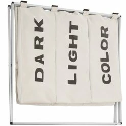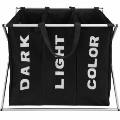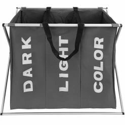 Facilitez-vous le tri du linge avec notre panier à linge triple tectake ! Séparez le blanc des couleurs et évitez les accidents de vêtements qui déteignent dans la machine à laver tout en gagnant du temps ! Les 3 compartiments de notre bac à linge sale vous mâchent le travail. Idéal pour votre salle de bain, votre chambre ou buanderie, il sera bien vite adopté par toute la famille. Vous apprécierez son design moderne qui se mariera au style de votre décoration. Le sac à linge est doté de 2 anses de transport pratiques au moment de la lessive. Lorsque vous n’en avez plus besoin, le cadre en aluminium se replie et se range dans les plus petits interstices de votre maison.