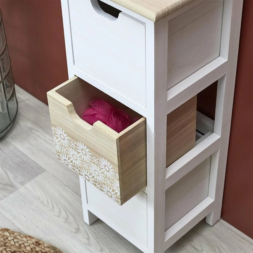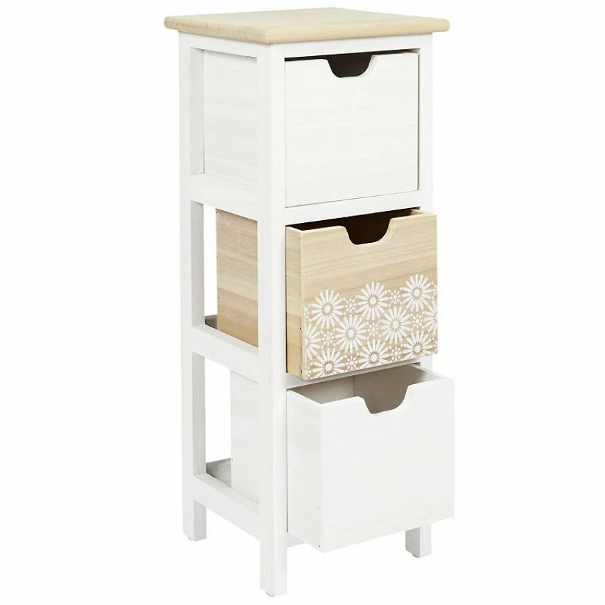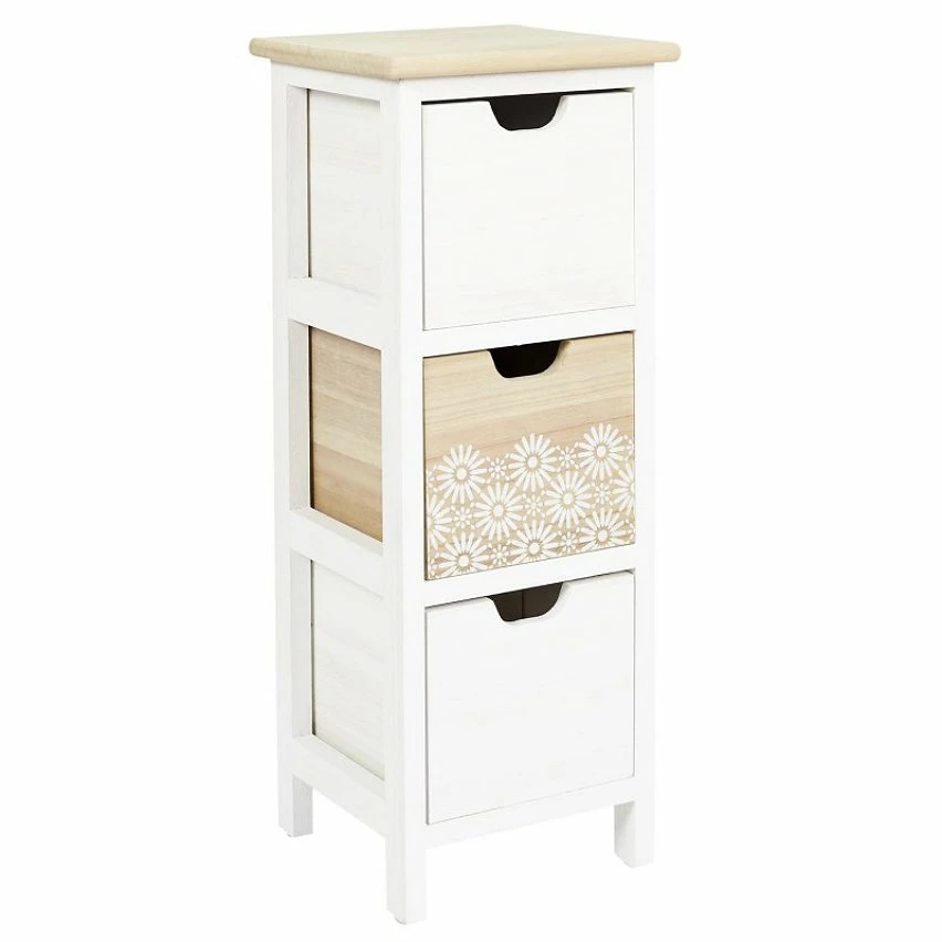 Bénéficiez de rangement supplémentaire avec le chiffonnier 3 tiroirs Chic coloris naturel et blanc. Avec ses motifs floraux, le chiffonnier apportera une touche bohème à votre pièce. Ne nécessite pas de montage. Dimensions : L. 25 x l. 25 x H. 65 cm. Poids : 2 kg. Marque : Home Déco Factory. Matière : Bois de paulownia.